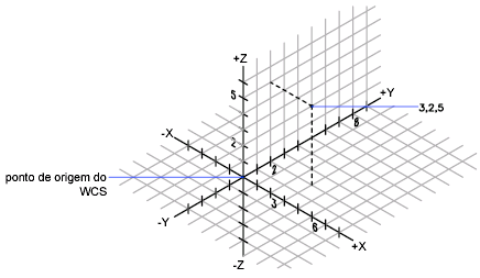 Na ilustração abaixo, as coordenadas 3,2,5 indicam um ponto de 3 unidades ao longo do eixo X positivo, 2 unidades ao longo do eixo Y positivo e 5 unidades ao longo do eixo Z positivo.