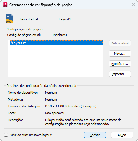 É possível criar também configurações de página nomeadas, modificar as existentes ou importar configurações de outros desenhos.