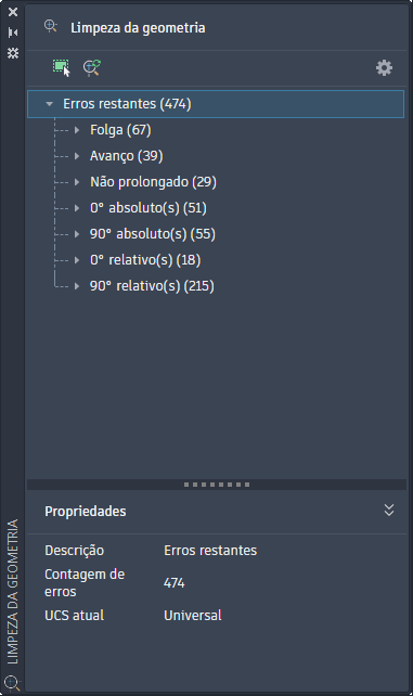 Abre a paleta Limpeza da geometria, que exibe possíveis erros de folga, prolongamento, não prolongado e angulares do desenho atual.