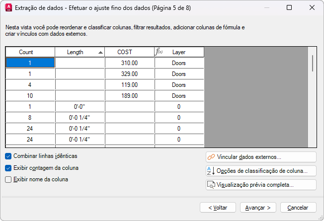 É possível extrair informações de objetos, tais como atributos do bloco e propriedades de desenhos, para criar uma tabela, uma lista de peças ou uma lista de materiais.