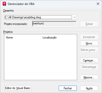 Exibe o Editor do Visual Basic, no qual é possível editar códigos, formulários e referências para qualquer projeto global do VBA carregado ou qualquer projeto do VBA incorporado em um desenho aberto. É possível também depurar e executar projetos a partir do Editor do Visual Basic.