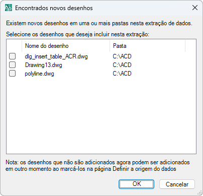 Quando novos desenhos são adicionados à pasta, a caixa de diálogo Novos desenhos encontrados exibe uma lista dos desenhos quando a extração de dados é editada. Nesse ponto, você pode selecionar os novos desenhos para adicionar à extração.