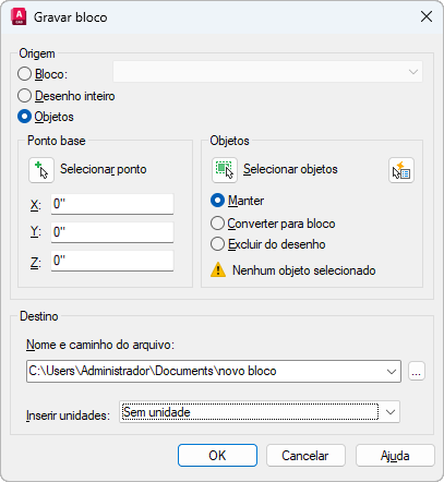 Salva objetos selecionados ou converte um bloco em arquivo de desenho especificado.