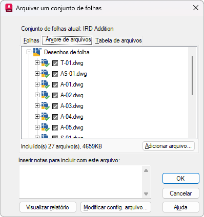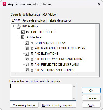 Lista as folhas a serem incluídas no pacote de arquivos na ordem das folhas e de acordo com a organização do subconjunto. Um conjunto de folhas deve estar aberto no Gerenciador de conjunto de folhas. Arquivar pode ser selecionado em um menu suspenso exibido quando se clica com o botão direito do mouse no nó do conjunto de folhas do nível superior ou ARQUIVAR pode ser inserido no prompt do comando.