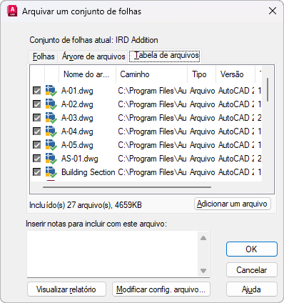 Exibe os arquivos a serem incluídos no pacote de arquivos em um formato de tabela. Por padrão, todos os arquivos associados ao desenho atual (como refex, estilos de plotagem e fontes relacionados) são apresentados. Você pode adicionar arquivos ao pacote de arquivos ou remover arquivos existentes. Os arquivos relacionados que são mencionados pelos URLs não são incluídos no pacote de arquivos.
