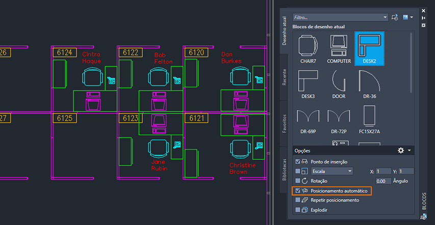 O posicionamento automático de blocos permite inserir blocos com facilidade usando a paleta Blocos, fornecendo sugestões com base em geometria similar e padrões aprendidos de instâncias de blocos anteriores em seu desenho.