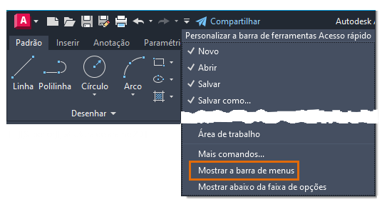 A barra de menus pode ser ativada a partir da barra de ferramentas Acesso rápido ou ao utilizar o menu suspenso IUP para personalizar a interface do usuário.