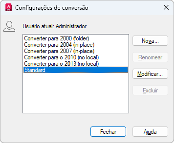 Exibe a caixa de diálogo Modificar configuração de conversão, na qual você pode especificar opções para a conversão de desenho selecionada.