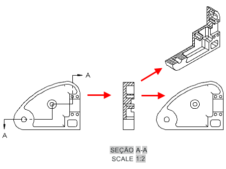 Uma vista em corte da documentação do modelo é uma vista projetada de uma vista de desenho existente, onde você usa uma linha de corte para recortar a vista de desenho para visualizar o que está no interior.