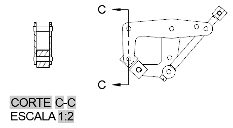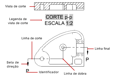 Componentes recortados pela linha de corte são hachurados na vista em corte. As práticas de desenho de engenharia mecânica exigem que componentes como fixadores e eixos não devam ser hachurados (corte).