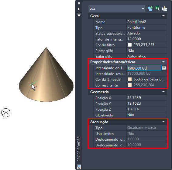 Quando a variável de sistema LIGHTINGUNITS é definida como 1 (unidade Americana) ou 2 (unidades Internacional SI) para a luz fotométrica, propriedades adicionais estão disponíveis para a luz puntiforme. As propriedades fotométricas a seguir podem ser definidas usando a paleta Propriedades: