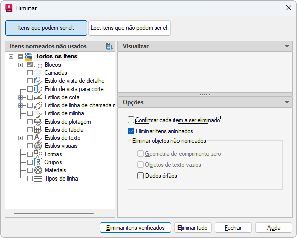 Lista os elementos no desenho atual que podem ser eliminados na vista em árvore no lado esquerdo. Os itens adicionais podem ser removidos do desenho no painel Eliminar objetos não nomeados no lado direito da caixa de diálogo.