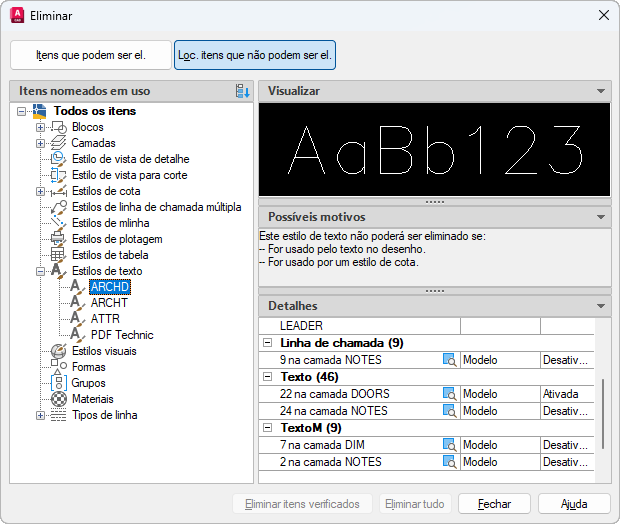 A maioria desses objetos são usados atualmente no desenho ou são itens padrão que não podem ser removidos. Quando você seleciona objetos nomeados individuais, as informações sobre o porquê de você não poder eliminá-los são exibidas.