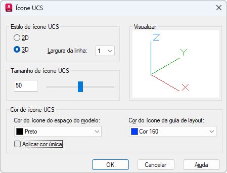 Controla as cores do ícone UCS nas viewports do espaço do modelo e nas guias de layout.