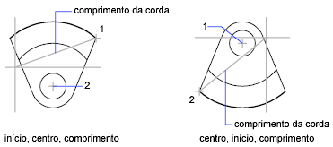 A distância entre este ponto inicial e o centro determina o raio. A outra extremidade do arco é determinada ao especificar o comprimento de uma corda entre o ponto inicial e o ponto final do arco.