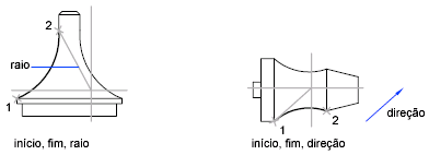A direção tangencial pode ser especificada ao localizar um ponto na linha tangencial desejada ou ao inserir um ângulo. Você pode determinar qual ponto final controla a tangente, ao trocar a ordem na qual especifica os dois pontos finais.