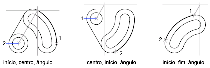 O ângulo incluído entre os pontos finais do arco, determinam o centro e o raio do arco.