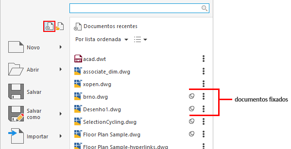 É possível manter um arquivo listado, independentemente dos arquivos que salvar posteriormente, ao clicar no botão de pino à direita do nome do arquivo. O arquivo é exibido na parte inferior da lista de documentos recentes até que se desative o botão de pino.