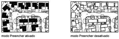 Quando o modo Preencher é desativado, os objetos listados são exibidos em forma de contorno. Com exceção de preenchimentos de gradiente e hachuras padronizadas, o preenchimento sólido é automaticamente desativado para vistas ocultas e 3D.