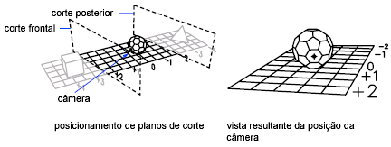 Você pode cortar as vistas do seu desenho posicionando os planos de corte frontal e planos de corte posteriores que controlam a visibilidade de objetos baseando-se na distância de uma câmera hipotética. Você pode mover os planos de corte perpendicularmente à linha de visão entre a câmera e o destino (onde a câmera está apontando). O corte remove a exibição de objetos da frente e de trás dos planos de corte. A seguinte figura mostra como os planos de corte funcionam: