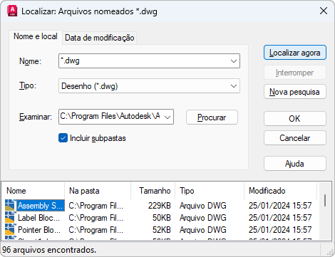 O tipo de arquivo a ser incluído na busca é determinado por tipo, de modo que não é necessário inserir uma extensão de arquivo em Named. Por exemplo, para localizar house102.dwg, insira house* e defina o Tipo como Desenho (*.dwg).