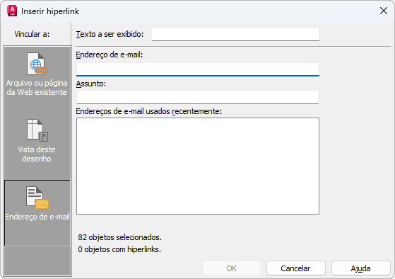 Relaciona os endereços de e-mail utilizados recentemente, que você pode selecionar para utilizar no hiperlink.