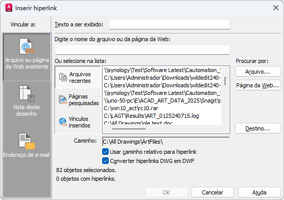 Exibe o caminho do arquivo associado ao hiperlink. Se a opção Use Relative Path for Hiperlink estiver selecionada, será exibido somente o nome do arquivo. Do contrário, o caminho completo e o nome do arquivo estarão relacionados.