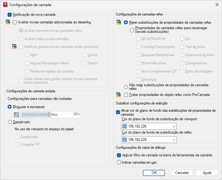 Controla quando ocorre a notificação para novas camadas, o comportamento de camadas quando algumas camadas estão isoladas, se são aplicados filtros à barra de ferramentas Camadas e a cor do plano de fundo das sobreposições de viewport no Gerenciador de propriedades de camada.