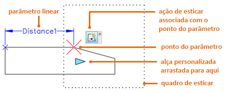 Em geral, primeiro você cria um parâmetro e, a seguir, você associa uma ação a esse parâmetro. O parâmetro é representado como um ponto de parâmetro com uma ou mais alças personalizadas que são exibidas quando o bloco é inserido no desenho e selecionado.
