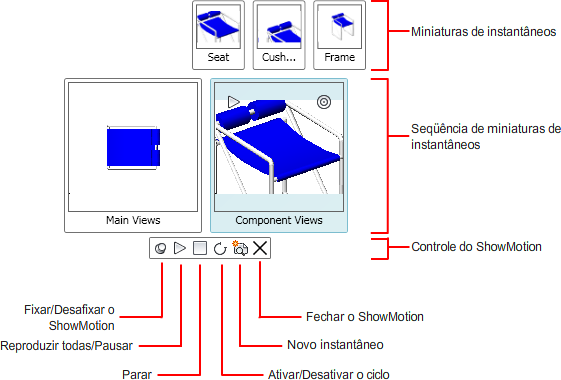 O ShowMotion consiste de três partes principais: miniaturas de instantâneos, miniaturas de sequências de instantâneos e o controle do ShowMotion. Com o controle ShowMotion, ao longo da parte inferior, é possível reproduzir as animações atribuídas a um instantâneo, fixar e desafixar o ShowMotion e fechar o ShowMotion. Utilize o instantâneo e miniaturas de sequências de instantâneos para navegar nos instantâneos disponíveis no modelo atual.