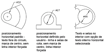 É possível criar diferentes estilos de cotas de diâmetro, como mostrado nas ilustrações.