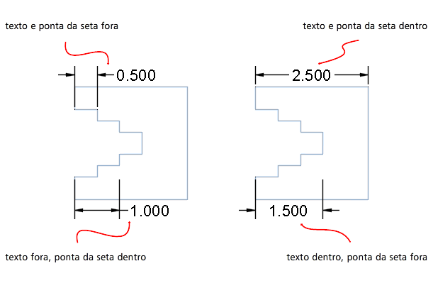 Mesmo que as pontas de seta estejam fora das linhas de extensão, uma linha de cota pode ser forçada entre as linhas de extensão.