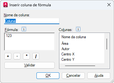 Verifica a validade da equação especificada. Uma coluna de fórmula somente pode ser inserida quando a fórmula é validada.