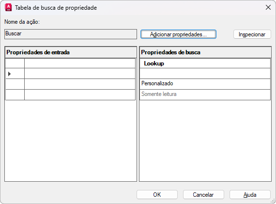 Exibe o valor personalizado atribuído às propriedades de entrada. Clique na base da coluna de pesquisa para tornar a propriedade de pesquisa como somente leitura ou para permitir a pesquisa reversa. Permitir a pesquisa reversa ativa uma lista suspensa associada com a alça de pesquisa que altera a referência de bloco para corresponder com os valores de propriedades de entrada na tabela.