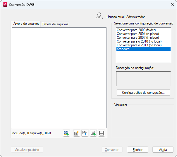 Abre uma caixa de diálogo padrão de seleção de arquivos, na qual você pode selecionar arquivos de desenho para adicionar à lista de conversão. Este botão está disponível na guia Árvore de arquivos e na guia Tabela de arquivos.