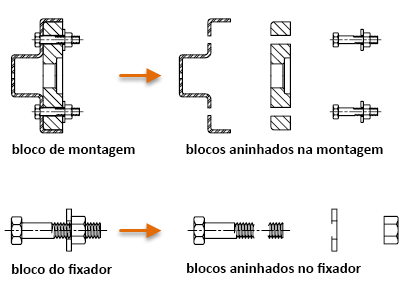 As referências de bloco que são incluídas em uma definição de bloco são chamadas blocos aninhados. O uso de blocos dentro de blocos pode simplificar a organização de uma definição de bloco complexa.