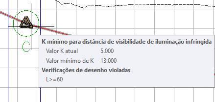 A curva ainda não atende o valor mínimo de k para a distância de visibilidade de ultrapassagem, então o os símbolos de aviso são exibidos. Para limpar um símbolo de aviso, a entidade deve atender a todos os valores especificados no arquivo de critérios de projeto e nas verificações de projeto aplicáveis.