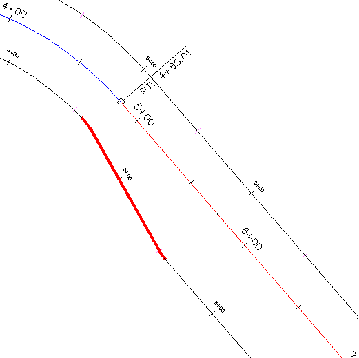 O desenho contém uma superfície e um alinhamento da linha de centro com dois alinhamentos de bordo. O alinhamento de bordo no lado direito do alinhamento da linha de centro tem duas regiões de alargamento.