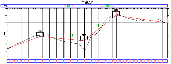Você pode agora desenhar o layout do perfil clicando no desenho nas localizações proposta dos PIVs. Em cada PVI, o aplicativo insere uma curva. Para ser realista, a linha deve seguir o perfil geral da superfície na linha de eixo. No entanto, é possível atravessar morros íngremes e vales para contornar uma superfície de estrada mais suave.