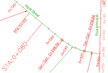 Observe que, no desenho, as legendas de texto STA: 0+080 e STA: 0+100 são de diferentes tamanhos e o texto e a linha são alinhados de maneira diferente. Um estilo secundário compartilha suas propriedades básicas com o estilo principal a partir da qual foi criado. Se um valor de propriedade sofrer alterações no estilo principal, a alteração também será aplicada ao estilo de secundário. Se um valor de propriedade sofrer alterações no estilo secundário, o estilo principal não será afetado.