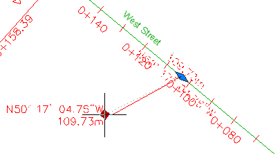 Observe que tanto o alinhamento da Main Street quanto o da East Street e suas legendas de estaca estão selecionados. As legendas foram selecionadas porque elas foram criadas no desenho referenciado externamente no qual os alinhamentos residem. Quando um objeto foi criado por meio de uma Refex, você somente pode editar suas legendas no desenho de origem.