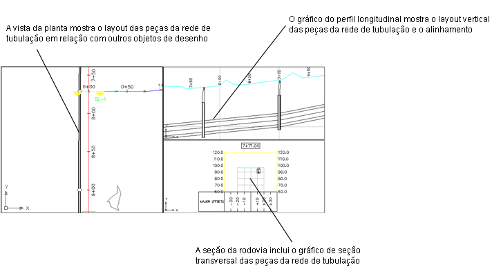 Esta ilustração exibe três visores: a rede de tubulação em uma vista de planta, o gráfico do perfil longitudinal de algumas das tubulações e estruturas de rede e as mesmas peças em um gráfico da seção.