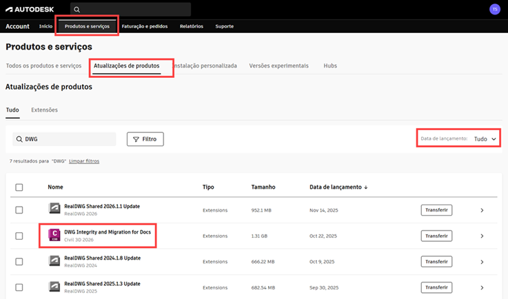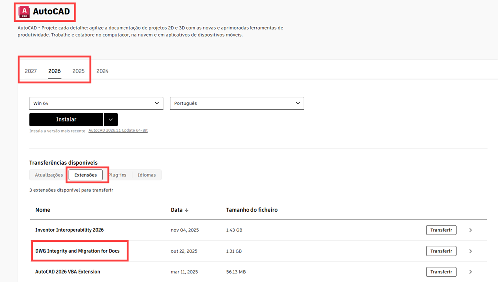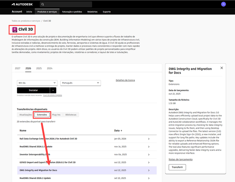 O instalador do DWG Integrity and Migration for Docs está disponível no site manage.autodesk.com e só pode ser acessado por clientes com uma licença válida do AutoCAD ou Civil 3D 2024-2026.