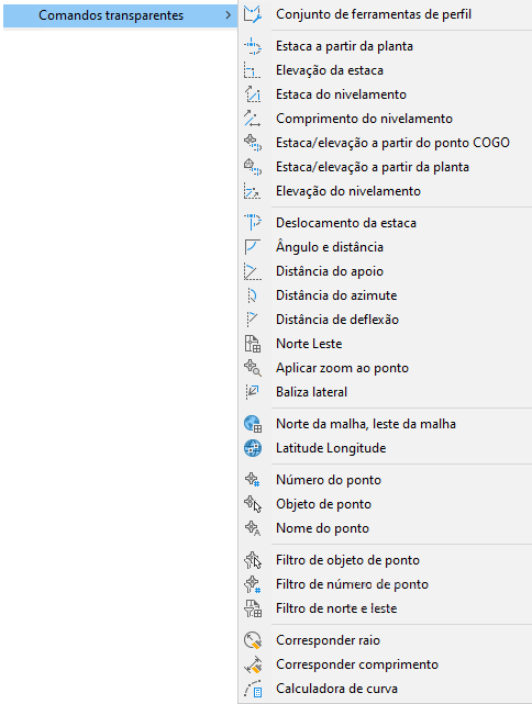 A maioria dos comandos transparentes do Autodesk Civil 3D é usada para especificar localizações de pontos em uma operação maior, como a criação de um alinhamento ou da linha de lote de um terreno. Usando estes comandos transparentes, você pode calcular a localização para um ponto a partir de informações, tal como um ângulo e distância, ou a partir de informações do objeto de ponto, tal como o número do ponto.