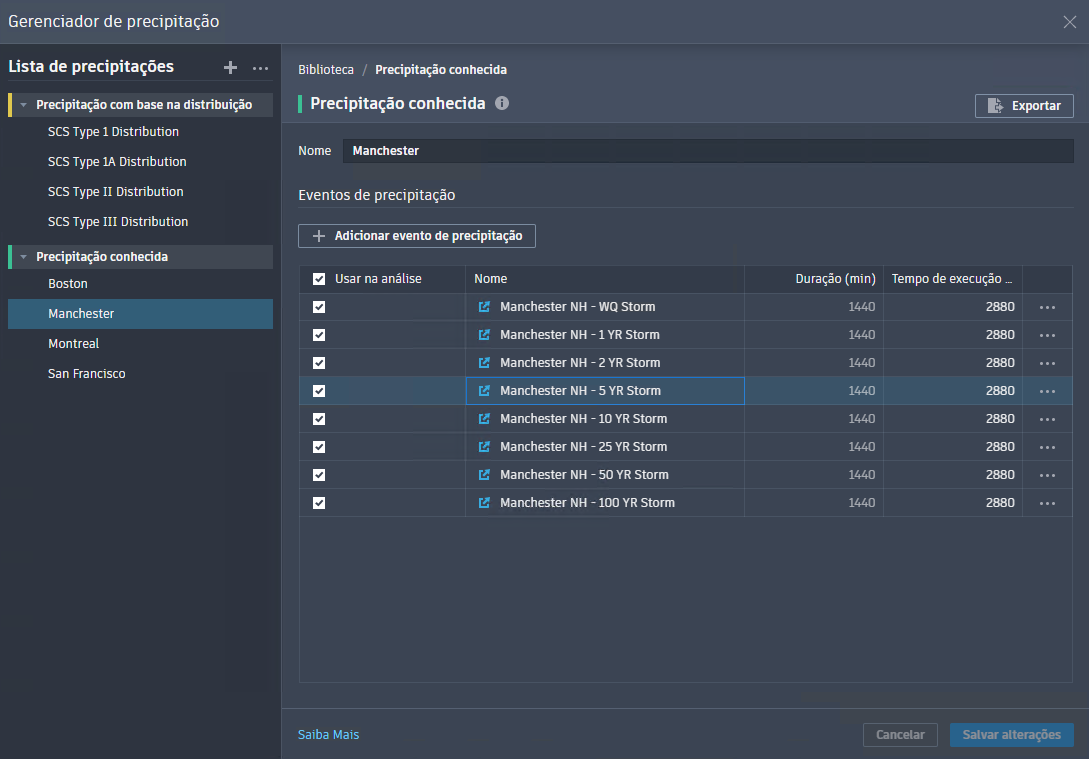 O Gerenciador de águas pluviais fornece uma localização centralizada para criar, editar e gerenciar todos os dados pluviométricos usados no software. Isso inclui padrões de águas pluviais predefinidos e eventos personalizados criados pelo usuário. Organize os dados pluviométricos em conjuntos comuns, garantindo acesso fácil e aplicação consistente em diferentes análises.