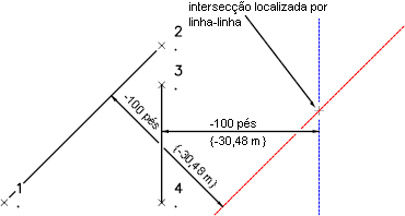 Uma intersecção é localizada entre uma linha desenhada pelos pontos 1 e 2, com um deslocamento de 100 pés para a direita, e uma linha desenhada pelos pontos 3 e 4, com um deslocamento de 100 pés para a esquerda.