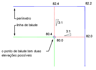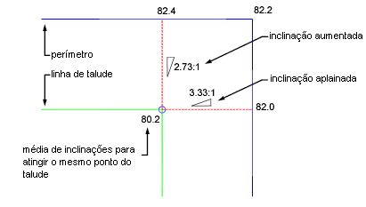 Especifica como as projeções de canto interno projeções são limpas quando o canto do perímetro canto tem diferentes elevações. Esta situação resulta em duas possíveis elevações de ponto de talude. Você pode escolher calcular a média das inclinações para atingir o mesmo ponto ou aumentar ou diminuir uma das inclinações.