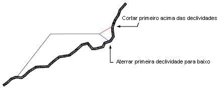 Nota: Tecnicamente, ambas as situações são de “aterro”. No entanto, o Autodesk Civil 3D trata a direção da inclinação ascendente como corte e a direção da inclinação descendente como aterro.