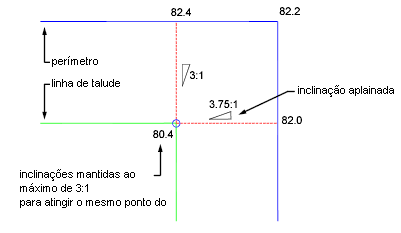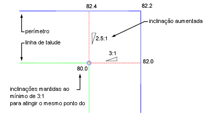 Manter inclinação em máxima: mantém a declividade ou inclinação especificada como máxima e aplaina a inclinação projetada a partir do perímetro em um lado.