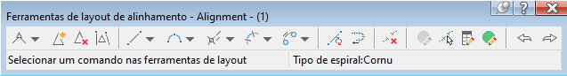 O nome do alinhamento selecionado no momento é exibido no topo da barra de ferramentas. Quando você clica em um ícone, o comando atual é exibido na parte inferior da barra de ferramentas. Esta janela permanece aberta quando se edita por alça o alinhamento ou insere outro comando. A barra de ferramentas é fechada quando você exclui o alinhamento selecionado ou clica no botão X no canto superior direito da barra de ferramentas.